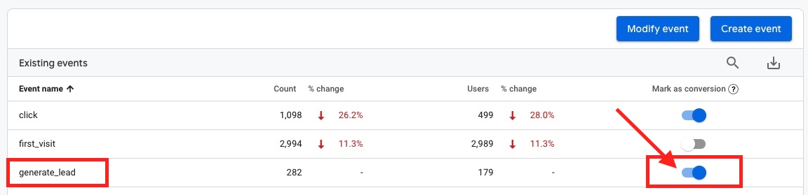 3.5. Configure ➜ Events ➜ click “Mark as conversion” on the desired events