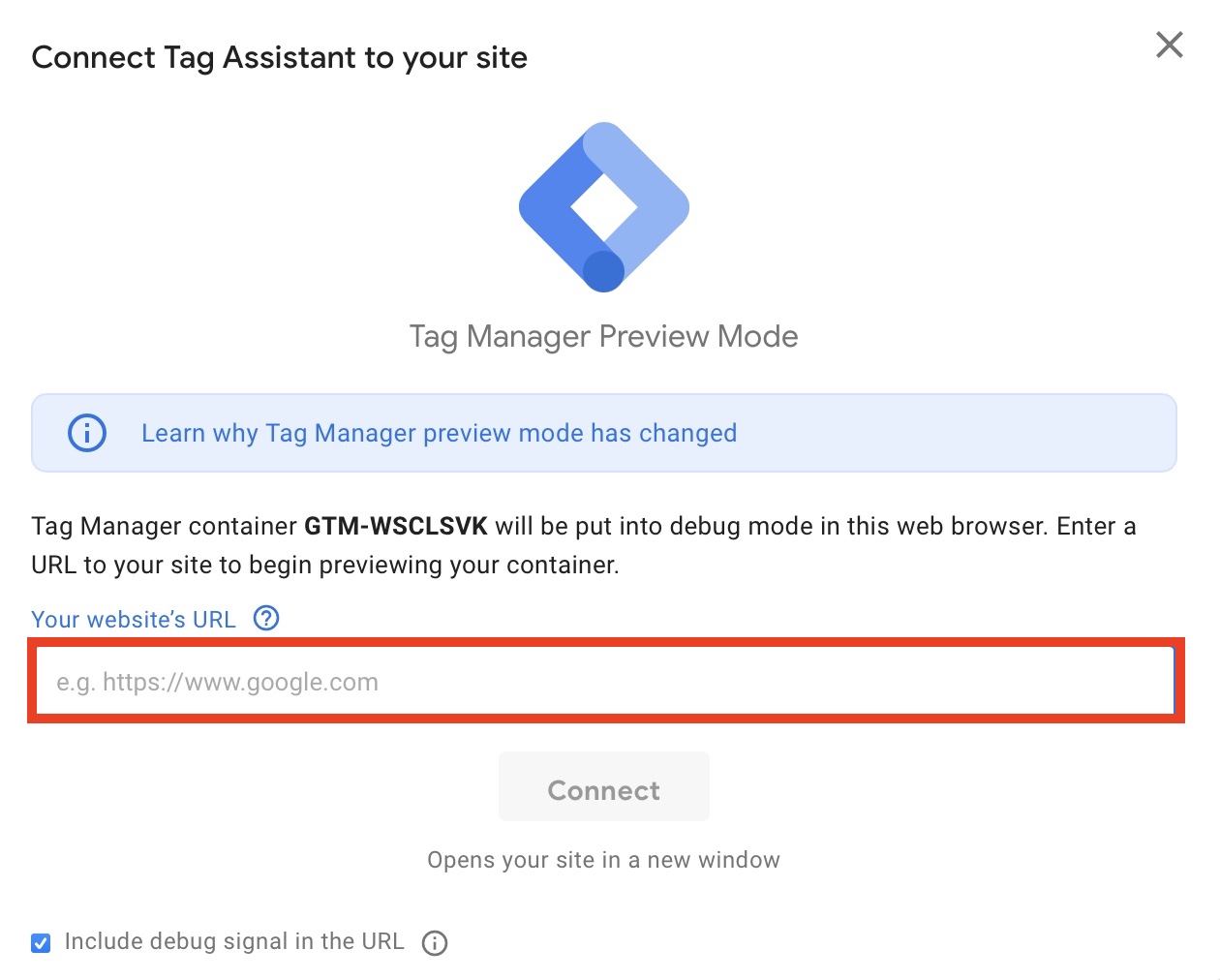 3.4.7. Click on the Preview button ➜ enter your website’s URL ➜ click Connect ➜ after the Debug page will be loaded click Continue and navigate to the Debug window