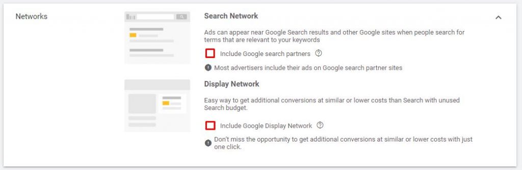 NOTE: I would suggest deselecting Google search partners sites and Display Network. This means that your ads will only run on Google Search Network.