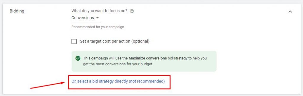 - Maximize conversions (be cautious with this type of bidding, cause it most likely overspends your budget)