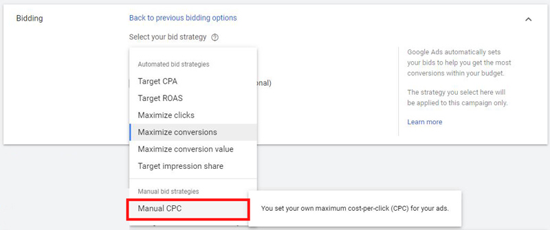 4.1. In the bidding section select bid strategy directly ➜ Select Manual CPC